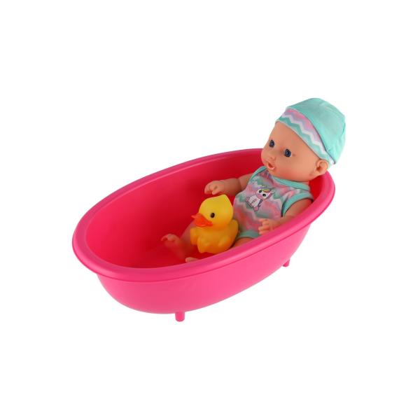 Panenka je uložena v plastové vaničce a připravena na koupací dobrodružství.