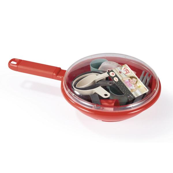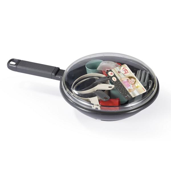 Pánev s poklicí a sadou nádobí obsahuje talíře, příbory, hrníčky, lžičky a další. Vyrobeno ve Francii. Materiál plast. Průměr pánve cca 20 cm. 2 druhy – bez výběru.