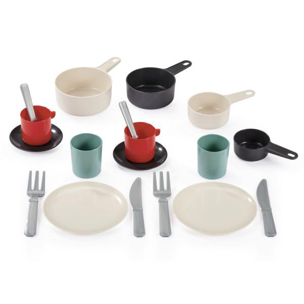 Pánev s poklicí a sadou nádobí obsahuje talíře, příbory, hrníčky, lžičky a další.