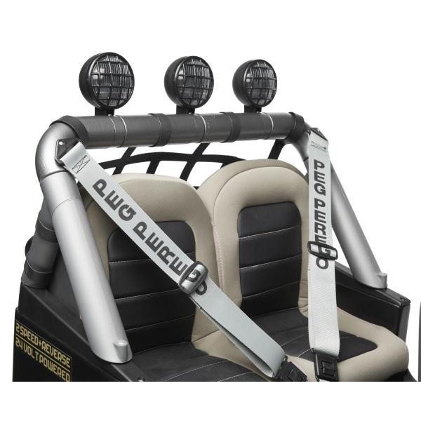 Realistické detaily Nastavitelná zpětná zrcátka skutečně fungují. Kromě toho další složité detaily, jako například zamřížované čelní sklo, přední nárazník a anténa, činí vůz jedinečným. Stejně jako ve skutečném vozidle, pevný nosič řízení zajišťuje, že vaše dítě nikdy nezůstane uvízlé, a zajišťuje přesné a bezpečné řízení. Plynový pedál a brzda jedním pedálem K ovládání vozidla stačí stlačit plynový pedál. Uvolněním pedálu se vozidlo automaticky zastaví. Pohon zadních kol a tlumiče Vysoká kola s tvarovaným dezénem nabízí skvělou trakci pro bezpečné cestování v terénu, dokonce i na štěrku a nerovném terénu, pro dobrodružství bez omezení! Silný pohon zadních kol umožňuje terénnímu vozidlu zdolávat svahy až o 17% a táhnout Adventure Trailer (příslušenství), i když je plně naložen. Tlumiče umožňují hladký a pohodlný výlet i v nejdrsnějším terénu. Nastavitelná sedadla a bezpečnostní pásy Dvě sedadla jsou nezávislá a nastavitelná ve dvou polohách. Podšívka z umělé kůže nabízí větší pohodlí a dva nastavitelné bezpečnostní pásy chrání před nárazy. Maximální přepravní hmotnost: 60 kg. Vzadu ochranná síťovina Síťovina chrání cestující a lze s ní přenášet drobné předměty, jako například pikniková přikrývka nebo batoh.