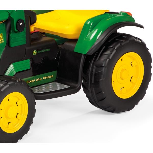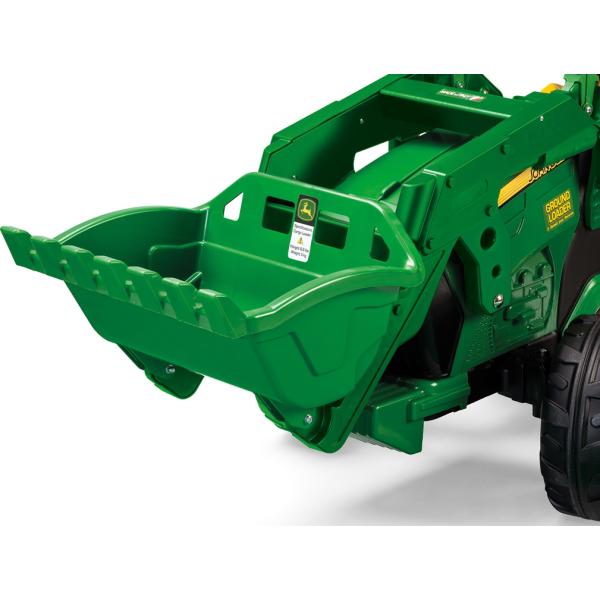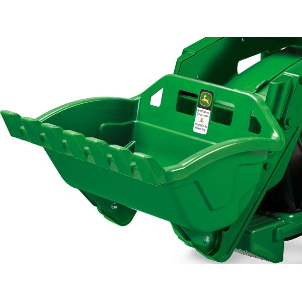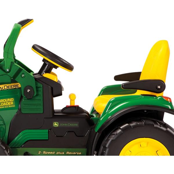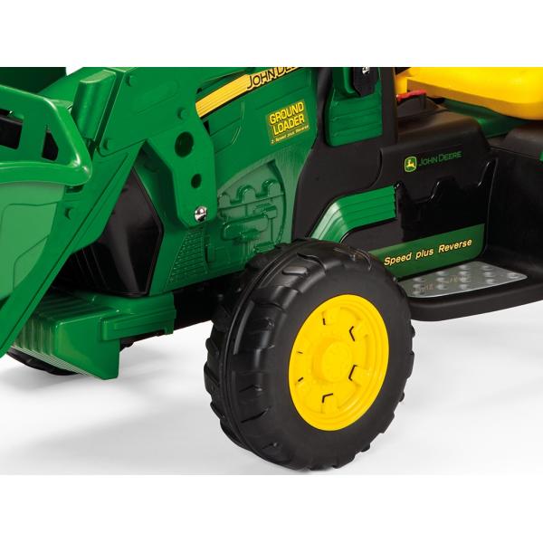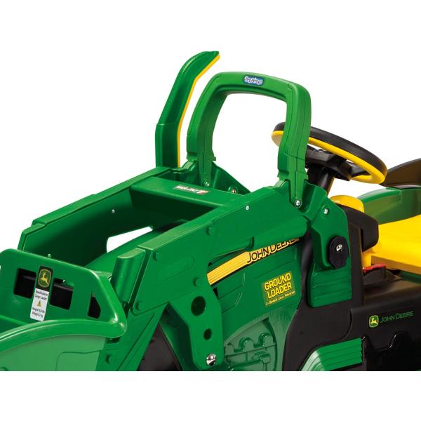 Peg Perego John Deere Ground Force Loader 12V – 330W. Stejný jako skutečný John Deere buldozer! Peg Perego byl reprodukován jedním z nejvýznamnějších zemědělských vozidel na světě, John Deere. Vynikající hračka, která přinese velkou radost dětem. John Deere Ground Loader je součástí velké škály produktů John Deere v kolekci Peg Perego. Jednomístné dětské elektrické vozidlo italské firmy Peg Perego. Elektrický traktor s nakladačem je určen dětem od 3 do 8 let. Dostatečný výkon motorů a baterie postačuje na dobu jízdy min. 40 minut a rychlost 3.5 km / ha 7.3 km / h vpřed a 3.2 km / h vzad. John Deere Ground Loader zvládne hrbolaté zpevněno i nezpevněné povrchy, nerovný terén s max. stoupáním 10%. Dětské autíčko má nastavitelné sedadlo do dvou poloh a sklopné loketní oprierky. Rychlosti vpřed a vzad se ovládají řídící pákou, akcelerátor a brzda jsou v jednom pedálu – po sešlápnutí akcelerátoru autíčko jde, po uvolnění zabrzdí. Vlečka není součástí balení!