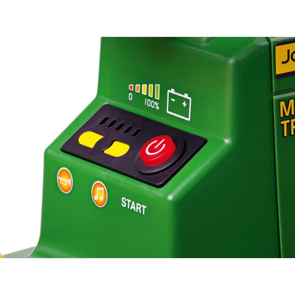 Jízda a brzdní Traktor je vhodný k provozu na zpevněném, rovném povrchu. Běhouny kol zajišťují optimální trakci na zpevněném terénu a umožňují stoupání až do 5%. Jedno-rychlostní, snadno ovladatelný pedálem na pravou nohu. Akcelerátor a brzda je v jednom pedálu. Stisknutím pedálu se rozjede, uvolněním automaticky brzdí. Zvukové efekty a vybavení Mini Traktor je vybaven předními LED světly, klaksonem, startovacím tlačítkem se zvukem motoru, tlačítkem zvukových efektů s 3 melodiemi a indikací nabití baterie. Popis