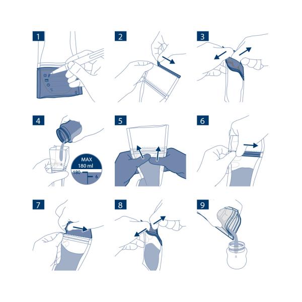 Samostojící sáček: Díky robustnímu designu sáček sám stojí ve vzpřímené poloze a široký otvor zaručuje snadné nalévání mateřského mléka do sáčku