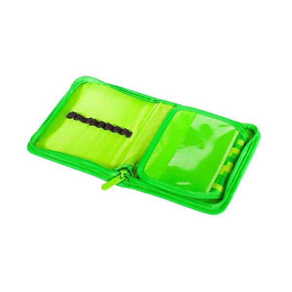 Jednopatrový školní penál s jednou klopou je vybaven šestnácti klasickými gumovými úchyty na pero, pastelky nebo fixy a čtyřmi širšími úchyty na pravítko, kružítko či nůžky. Celou šířku klopy zabírá kapsa z průhledné fólie, ideální…