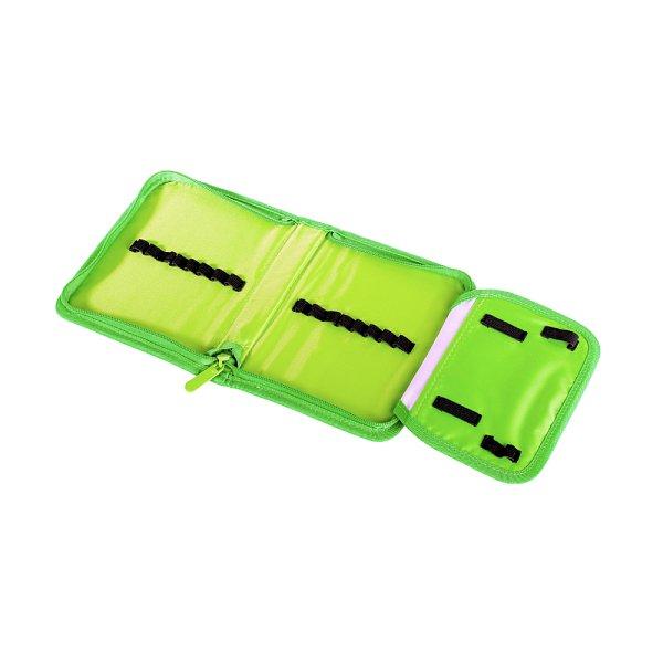 Jednopatrový školní penál s jednou klopou je vybaven šestnácti klasickými gumovými úchyty na pero, pastelky nebo fixy a čtyřmi širšími úchyty na pravítko, kružítko či nůžky.
