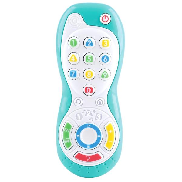 Televizní ovladač s efekty. Rozměry 5,5×3,5×14,5 cm. Zvukové efekty – zvuky, písně, angličtina. 2xAAA baterie součástí.
