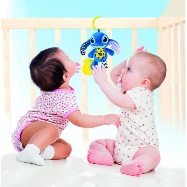 Roztomilá plyšová hračka Stitch s množstvím aktivit: šustící uši, dva měkké plastové doplňky na žvýkání a chrastítko uvnitř plyše. Praktická spona usnadňuje zavěšení kdekoli.