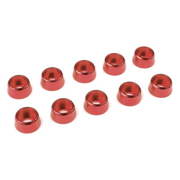 Červeně eloxovaná podložka pod hlavu šroubu M4 s válcovou hlavou. Vnější průměr 10 mm, materiál hliník. Balení obsahuje celkem 10 ks podložek.