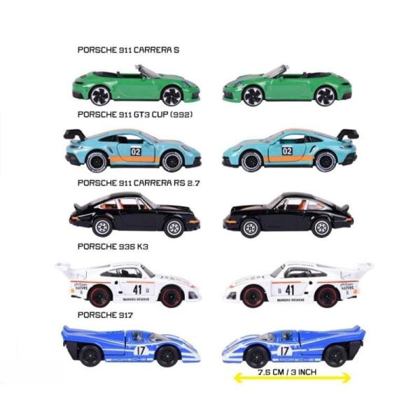Dárková sada kovových sportovních autíček Porsche na volnoběh. Délka autíčka 7,5 cm.