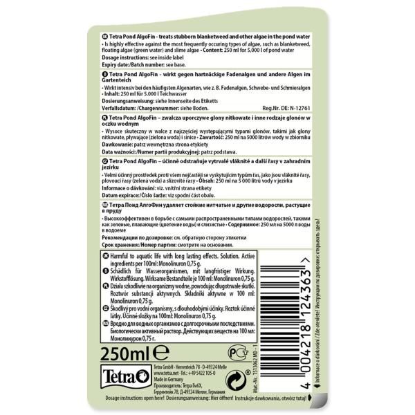 Přípravek k intenzivnímu boji s řasami v zahradních nádržích. Růst řas může narušit biologickou rovnováhu v nádrži a způsobit nepříjemný vzhled. Algofin vytváří takové biologické podmínky, za kterých je zamezeno rozmnožování řas. Udržuje čistou vodu v zahradních nádržích. Dávkování: Aplikujte 50 ml na 1000 l vody. Při dalším použití 25 ml na 1000 l vody každý 4-6 týden. Balení vystačí na 5000 l vody.