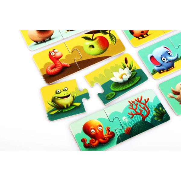Poznáte kde které zvířátko bydlí? V krabičce najdete 20 velkých pevných puzzlů, tvořících 10 samostatných dvojic kartiček, které spolu tematicky souvisí. Jedna polovina kartiček obsahuje ilustrace jednotlivých zvířátek a na druhé polovině kartiček je vyobrazeno jejich nejčastěji obydlí. Cílem je vytvořit správné kombinace a nasbírat co nejvíce párů. věk 2+