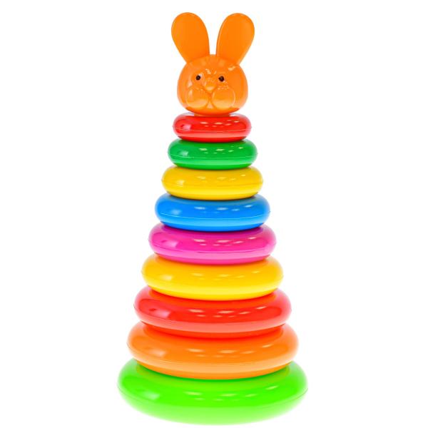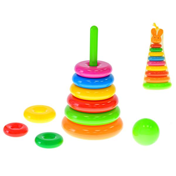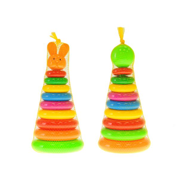 Skládačka pyramida s kroužky, díky které se děti učí rozeznávat barvy a velikosti. Hračka rozvíjí motorické schopnosti dítěte a logické myšlení. Pyramida je z měkkého plastu a je vysoká 30 cm. Dva druhy – zajíček, pyramida. Není možnost výběru.