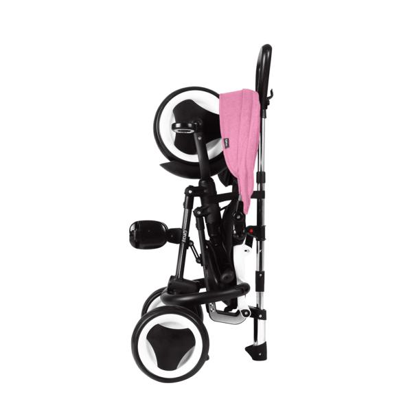 Vlastnosti:- Výškově nastavitelná řídítka pro rodiče.- Skládací – odnímatelná sluneční clona s UV ochranou UPF 50+.- Opěrka sedadla s 2 naklápěcími polohami pro pohodlnou jízdu.- Prodyšný měkký sedák a opěrka zad.- 5-bodové nastavitelné pásy.- Možnost zvolit si, kdy řídítka kola bude vaše dítě ovládat a kdy ne, se systémem uzamykání.- Funkce volnoběhu pro pohodlí a bezpečnost během jízdy. Tato funkce nám umožňuje vybrat si, kdy se pedály otáčejí spolu s kolem a kdy ne.- Sklopná opěrka nohou.- Přídavná odnímatelná opěrka nohou na podporu nohou v případě spánku během jízdy.- Brzdy na zadních kolech.- Odnímatelná zadní kola na 1 kliknutí.- Odnímatelná ochranná tyč.- Ergonomický design na otevírání a zavírání na 3 kliknutí bez použití nářadí.- Jednoduché uzavření na skladování a přepravu.- Po složení ho nemusíte zdvíhat na přepravu, můžete ho jednoduše posouvat jako cestovní tašku.- Špičková kolečka z pevné antivibrační pěny.- Velký úložný koš, který se uzavírá.- Odnímatelná taška na rodičovské rukojeti, vhodná na drobné předměty.- Bez kadmia a ftalátů.