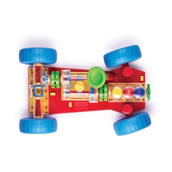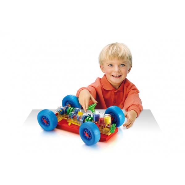 Chytrá hračka, která přímo vybízí děti i jejich rodiče k zjištění, jak takové skutečné auto funguje. Všechny základní mechanické funkce jsou zde přesně reprodukovány. Při motoru děti uvidí, jak pracují válce a klikový hřídel a jak jsou spojeny s převodovkou, která má funkční řazení se 3 polohami (neutrální, 1. a 2. stupeň). Diferenciál přenáší pohyb na zadní kola a umožňuje jejich otáčení nezávisle na sobě. Všechny mechanické části je možné snadno připojit k podvozku a stejně tak je možné je uvolnit speciálními odpruženými žlutými tlačítky. Volant funguje a umožňuje autu zatáčet nebo zajíždět do parkoviště.