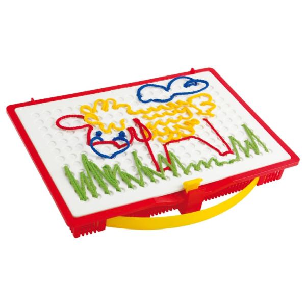 Obrázky a vzory tvořte zasouváním šňůrek pomocí speciálních per do otvorů hrací desky, která je zároveň víkem kufříku. Po vytažení pera z otvoru se tento zatáhne a barevnou šňůrku pevně drží. Přiložená brožurka obsahuje příklady, kterými se začátečníci mohou řídit a také 8 karet se 16 vzory.Hračka je určena dětem od 4 let.