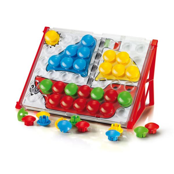 Výborná didaktická mozaika určená dětem od 2 let. Tabulku zasadíte do bočních stojánků, aby se dětem dobře pracovalo, a zasunete pod desku některou ze 16 šablon (8 obrázků x2: z jedné strany pro menší děti, z druhé strany pro větší). Sada rozvíjející dětskou motoriku, kreativitu a fantazii se skládá z hrací desky s otvory, 48 velkých barevných knoflíků a 16 karet s předlohami. Vyrobeno z plastů špičkové kvality.