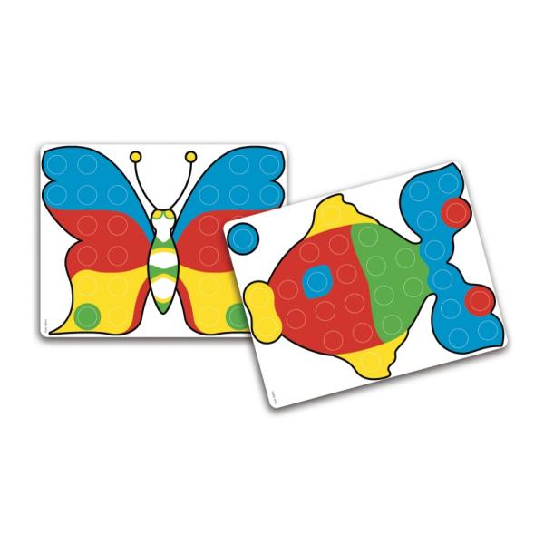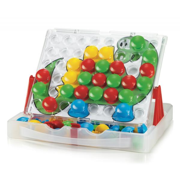 Děti od 2 let mohou snadno tvořit své první mozaikové vzory ze 48 velkých, nerozbitných knoflíků, které vkládají do průhledné desky s otvory. Pod desku je možné snadno vložit jednu ze 16 karet s předlohami.