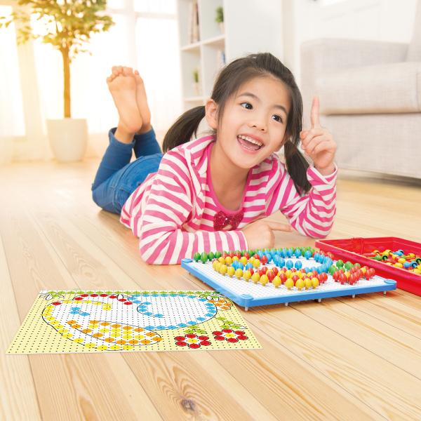Kreativní mozaiková hra určená dětem od 4 let. Perforovaná plastová deska je vsazena v košíku s oblými hranami. Děti vkládají plastové barevné kolíčky do otvorů v desce a vytvářejí obrázky podle šablony z přiloženého alba, nebo si mozaiku tvoří podle vlastní fantazie.