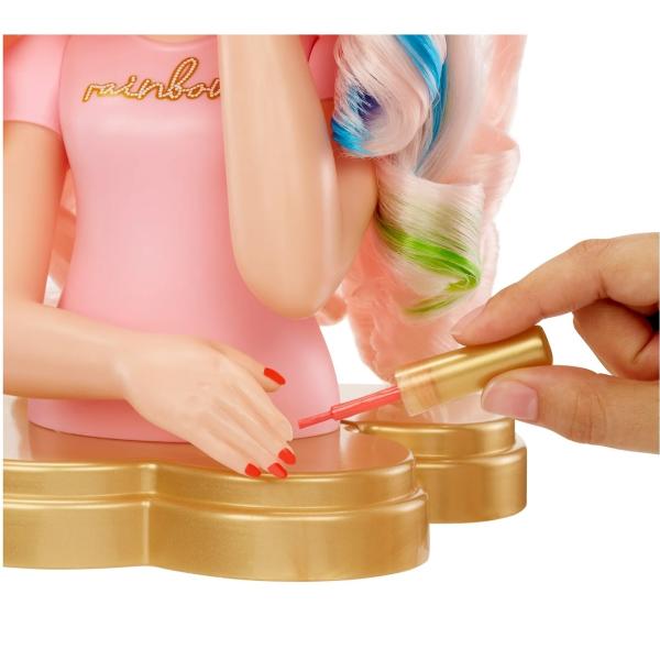 Představujeme naši první sadu Rainbow High česací hlavy 4 v 1. Jste na řadě se stylem, barvou a hraním – znovu a znovu. Barevné krémy můžete dokonce použít na vlastní vlasy a lak na nehty! Poté jen opláchněte a zopakujte a udělejte to znovu. Bella stylingová hlava má krásné dlouhé světle růžové vlasy s kadeřemi a snadno se s ní vytvářejí nekonečné účesy. Pomocí přiloženého hřebene vytvořte zábavné účesy, jako jsou copy, ohony, drdoly a mnohé další. Je tak snadné barvit její vlasy. Vyberte si svou oblíbenou barvu (růžovou, modrou, fialovou) a jednoduše ji přidejte do nástroje na barvení. Poté ho použijte stejně jako žehličku na dodání barvy do vlasů. Můžete přidat více barev. Nakonec si děti mohou procvičit lakování nehtů s přiloženým lakem na nehty. Stačí nalakovat nehty stylingové hlavy. A pokud něco pokazíte nebo si to dokonce chcete zopakovat, stačí to všechno utřít mokrým ručníkem a začít znovu. Je to tak jednoduché! Je tak snadné dělat to znovu a znovu. Stačí vlasy umýt mýdlem + vodou, nechat uschnout a začít tvořit znovu! A na nehty stačí použít mokrý ručník, abyste to všechno utřeli.