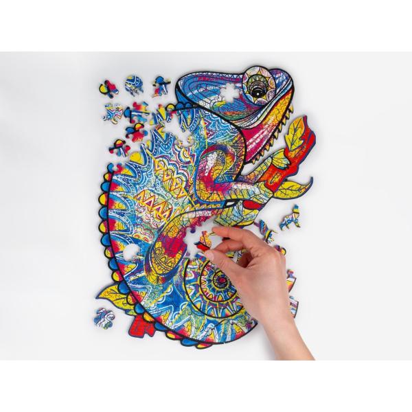 RECENTTOYS Dřevěné puzzle – Chameleon jsou nepřehlédnutelná dřevěná puzzle s výrazně barevným motivem, který okamžitě upoutá. Kombinace sytých barev, detailních vzorů a originálního tvaru vytváří jedinečný puzzle zážitek, který je zábavný i vizuálně atraktivní.