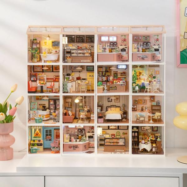 Spojením různých miniatur řady Super Creator Series vertikálně nebo horizontálně můžete vytvořit rozmanitý komplex domečků. Ochraňte svůj výtvor pomocí krytů proti prachu a nečistotám – DWP05 Dveře proti prachu B a DWP02 Střecha typu B.