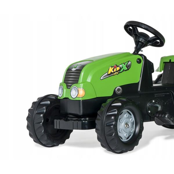 Posuvné sedadlo umožňuje nastavení podle věku a výšky dítěte. Otevíratelná kapota a říditelná přední náprava dodávají traktoru realistický charakter. Extra stabilní 12 mm silný hřídel zadních kol zaručuje pevnost a odolnost konstrukce. Plastová kola se snímatelným gumovým páskem lze kdykoli vyměnit za nová – kola tak zůstanou vždy nepoškozená.