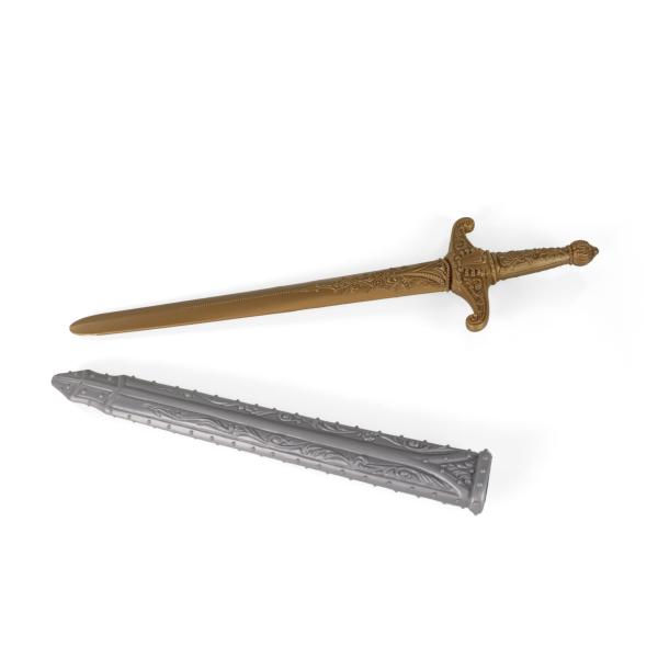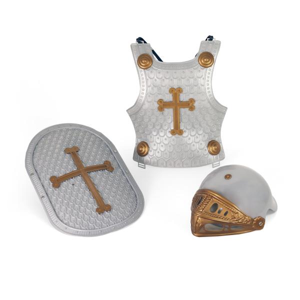 Balení obsahuje bronzový meč ve stříbrné pochvě, ochranný štít, helmu s nastavitelným krytem a rytířskou vestu.