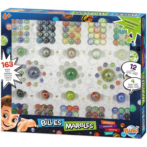 Sada 163 skleněných kuliček různých velikostí a vzhledu. Vzhled skleněk je to, co dělá rozdíl mezi touto sadou a ostatními běžnými kuličkami na trhu. V sadě jsou např. duhovky, perleťovky, žíhané, tečkované, mramorové, plnofarebné, metalické a dokonce i fosforeskující ve tmě.