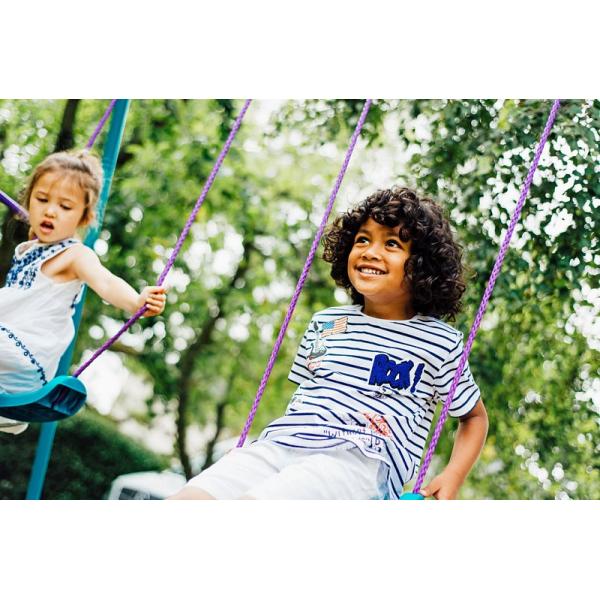 Set dvou houpaček s kovovou konstrukcí Plum® je ideální pro celoroční venkovní zábavu. Rám je vyroben z oceli, která je pro další ochranu proti rzi opatřena práškovým nástřikem. Plastová sedátka zavěšená na nastavitelných lanech je možné nastavit podle výšky dítěte. Součástí balení jsou zemní kotvy pro zajištění houpačky do země.