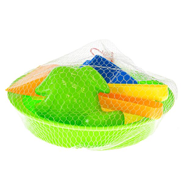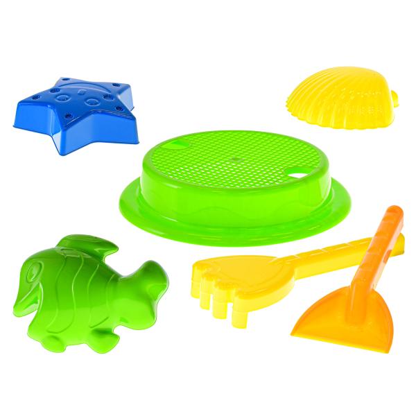 Sada na písek obsahuje sítko, lopatku, hrabičky a 3 ks formiček o velikosti 10-11 cm.