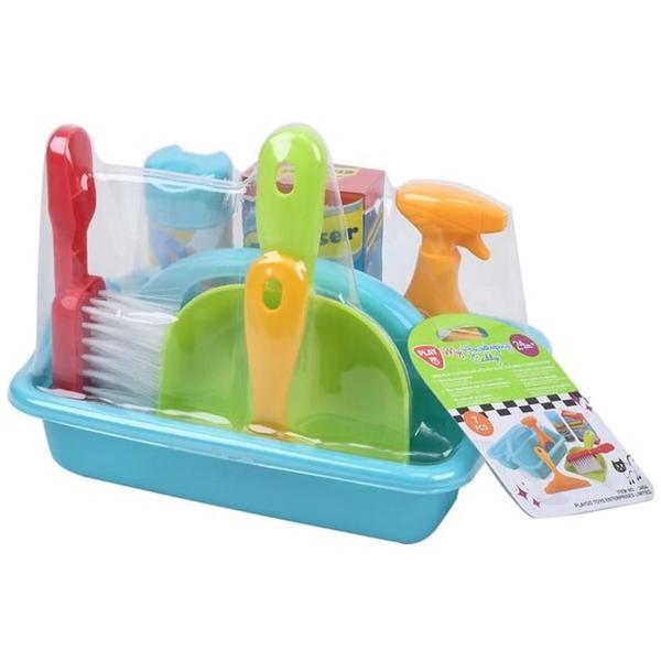 Chceš pomoci mámě a tátovi s úklidem? Tato čistící sada je zabalena v praktické světle modré nádobě s rukojetí. Vložte věci do zásobníku a snadno je přemístěte z jednoho místa na druhé. Čistící set se skládá ze tří čistících prostředků, zeleno/červené sady košťat a žluté stěrky na okna. Věk: 3+