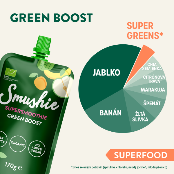 Co dělá Smushie BIO Green Boost výjimečným?100% přírodní pečlivě vybrané ingredience v BIO kvalitě podporující aktivní životní styl. Osvěžující chuť díky vyvážené kombinaci jablka, špenátu, marakuje a citronové trávy s chia semínky. A především zeleným boostem superpotravin v podobě řas (spiruliny, chlorelly), mladého ječmene a pšenice – ingredience ceněné pro své rozmanité vlastnosti.