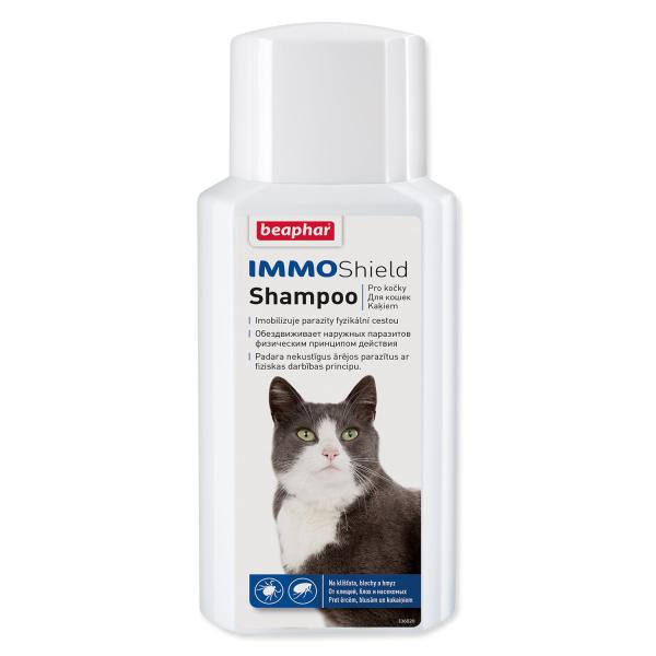 IMMO Shield šampon pro kočky obsahuje silikonový olej (dimetikon), který fyzikálním způsobem znehybňuje blechy, klíšťata a veškerý ostatní hmyz , zejména komáři, roztoči, vši a všenky. Vhodné pro kočky od 12 týdnů věku Působí na všechna vývojová stadia blech Usnadňuje následné rozčesávání srsti Složení: dimetikon 37,4 g/l, aloe vera 0,23/l, parfém 0,09 g/l Návod k použití: Naneste 1,5 uzávěru IMMO Shield šamponu na mokrou srst zvířete. Šampon dobře vmasírujte alespoň 2 minuty, nechte 5 minut působit, poté jej důkladně smyjte a srst vysušte. Nepoužívejte na březí a kojící samice. Nezapomeňte ošetřit okolí zvířete sprejem IMMO Shield jako prevenci před dalším napadením parazity.