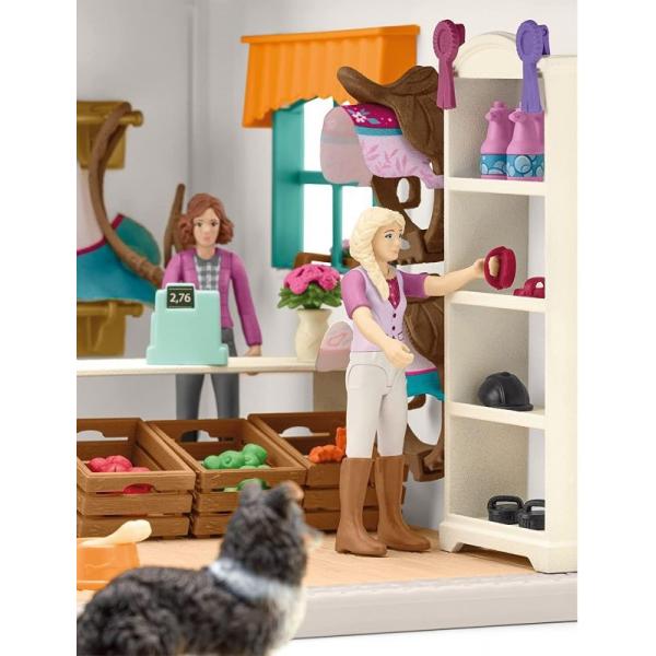 Cink! Zákazníci jsou tady! Přijď do jezdeckého obchodu z kolekce Schleich® HORSE CLUB, kde si můžeš celé hodiny prohlížet zboží a poté s úsměvem odjet. Buď proto, že jsi našel něco opravdu skvělého pro svého koně, nebo proto, že ti paní za pultem složila kompliment. Ona je totiž vždy nadšená ze všech koní, co máš ve sbírce. Ve svém obchodě prodává jen to nejlepší. Krmivo, sedla, kartáče, dokonce i psa – a ano, možná i tu sponku, co se ti ztratila minul týden. Určitě ti brzy dá slevu pro stálé zákazníky a jako vždy má pro tebe vlídné slovo. Sada obsahuje: 1× obchod pro koně, 2× mrkev, 1× sprej, 1× dřevěný kůň, 2, uzda, 2× sedlo, 1× zahradní hadice, 3× box s krmivem, 2× hřeben, 2× kartáč, 2 × jablko, 2× ocenění pro vítěze, 1× trofej, 1× balík slámy, 1× váza, 1× jezdecký klobouk, 1× pokladna, 1× miska na krmení, 1× psí kost, 2× deka pro koně, 2× deka pod sedlo, 1× ohlávka, 2× plně pohyblivá figurka, 1× kůň, 1× pes, 1× prodejní pult. Rozměry: 34,5 x 40 x 10,5 cm Věk: 3+