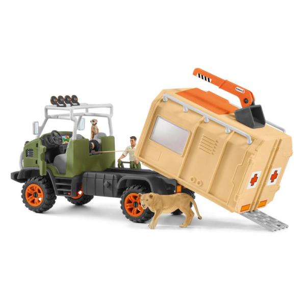 Správce parku Tom a jeho kamarád PERMONÍK Ted jdou společně ve velkém záchranném voze pro zvířata Schleich®Wild Life na svou první společnou misi. Na Safari najdou Tom a Ted lvici, která musí být urgentně ošetřena. Tom a Ted tedy spustí ošetřovací kabinu auta na zem. Nyní lze začít s ošetřením, protože auto je na to perfektně vybavené. Obvazy a stetoskop má ranger Tom stále při ruce. Po ošetření bude lvice přeložena do transportního boxu. Jeřáb nejdříve vytáhne kabinu zpět nahoru a následně lze na auto připevnit transportní box. Tom a Ted vypustí lvici při velkém vodním zdroji. Tam se zotaví! Funkce velkého nákladního automobilu: otočný jeřáb, snímatelný kontejner, zabudovaná nákladná rampa, lanový naviják s flexibilní montáží a klec lze uložit do nákladního auta. Schleich® figurky jsou všechny modelované v nejjemnějším detailu, láskyplně malované a povzbuzují děti k tomu, aby hráli a zároveň se učili. Sada obsahuje: 1x lev, 1x PERMONÍK, 1x správce parku, 1x jeřáb s lanovým navijákem, 1x klec, 1x nákladní auto, 1x žebřík, 1x kontejner, 1x stetoskop, 1x obvaz. Rozměr balení: 39 x 23 x 11 cm. Věk: 3-8