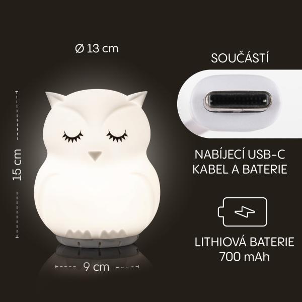 Stylová a praktická noční lampička ve tvaru roztomilé zvířátka je skvělým doplňkem do každého dětského pokoje. Spojuje jemné osvětlení, zábavné funkce a moderní technologie, které ocení děti i rodiče. Je ideální i na umístění přímo do postýlky, kde svým tlumeným světlem vytváří příjemnou atmosféru pro ničím nerušený spánek. Lampička je vyrobena z mimořádně jemného silikonu, který je příjemný na dotyk, odolný a bezpečný i pro nejmenší děti. Silikonovou část lze navíc jednoduše umýt v myčce, což zaručuje vždy hygienické použití.