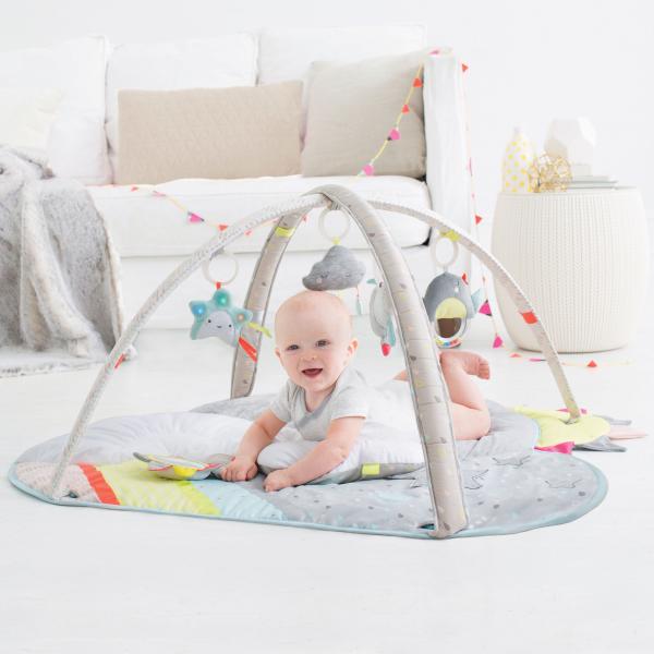 Krásná hrací deka z měkké Minky je jednou z produktů nové kolekce „Silver Lining“ značky Skip Hop, která se vyznačuje něžnými, jemnými barvami pro stimulaci dětského zraku. Deka obsahuje závěsné hračky jemného vzhledu: sluníčko s…