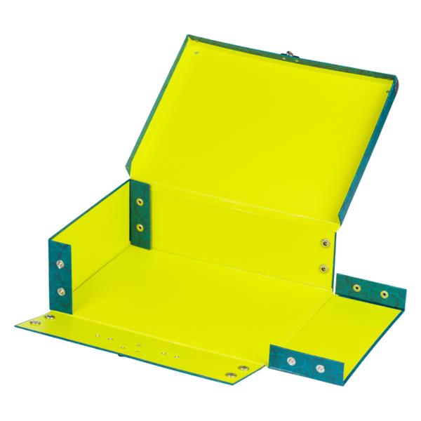 • Skládací kufřík z pevného laminovaného papíru. • Unikátní provedení s patentkami, díky nimž lze vždy znovu složit a rozložit. • Opatřené kovovou rukojetí a uzavíráním na klasickou přezku.