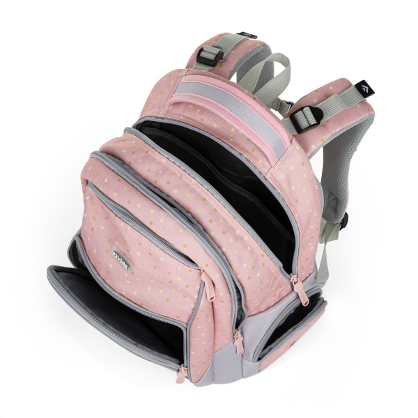 Školní batoh z řady OXY GO na sebe jednoduše strhne pozornost. Designové provedení zaujme každého kluka i dívku. Perfektní tvar batohu ukrývá nejen anatomicky tvarovaná a prodyšná záda, ale také možnost nastavit si ramenní popruhy pro lepší pohodlí a komfortnější nošení. Dvě vnitřní kapsy nabízejí dostatek prostoru pro učebnice, sešity i věci pro volný čas. Pevné dno zabraňuje jak ušpinění zvenčí, tak přetečení čehokoli, co se vylije uvnitř. Po stranách naleznete dvě větší kapsy. Batoh nabízí velkorysé množství nejrůznějších kapes, ať už velkých nebo i malých. Hledání klíčů v batohu proto nehrozí. Lehký, přitom dostatečně velký pro všechny věci, které chce mít každý školák po ruce. Mysleli jsme také na bezpečnost vašich dětí, proto batohu nechybí reflexní prvky. Batoh je ideální na první stupeň 1. – 3. třídu pro děti vysoké od 125 cm.