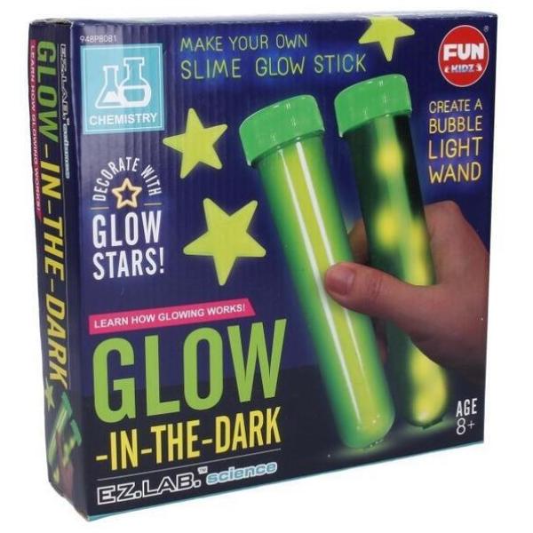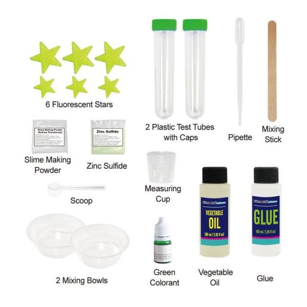 Vyrob si vlastní sliz svítící ve tmě! Stačí smíchat přísady správným způsobem a zábava může začít! Sliz můžeš libovolně natahovat, mačkat a tvarovat! Jednoduchá výroba slizu pomocí několika jednoduchých kroků – do misky nalijte trochu slizového lepidla, na lepidlo přisypte trochu svítícího prášku a zamíchejte. Aktivátor přidávejte za stálého míchání po kapkách, dokud nejste s hustotou a lepivostí slizu spokojeni (čím více aktivátoru, tím tužší sliz). Počkejte pár minut a sliz je hotov! Kreativní sada obsahuje: 2 zkumavky, materiál a pomůcky pro výrobu slizu 6 fluorescenčních hvězdiček návod. Doporučený věk: od 8 let