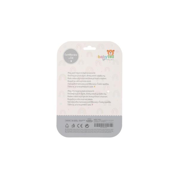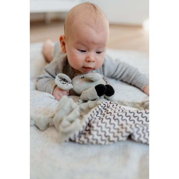 Vyrobený z měkkoučkého minky materiálu s 3D tečkami poskytuje příjemný a uklidňující dotyk, který pomáhá dítěti usínat a cítit se bezpečně. Uvnitř je ukryta jemná chrastítko, která podporuje sluchový rozvoj dítěte. Jeden z rohů je doplněn o měkké silikonové kousátko, které uleví od bolesti při prořezávání zoubků. Uzlíky na rozích navíc stimulují hmat a jsou snadno uchopitelné i pro nejmenší ručičky.