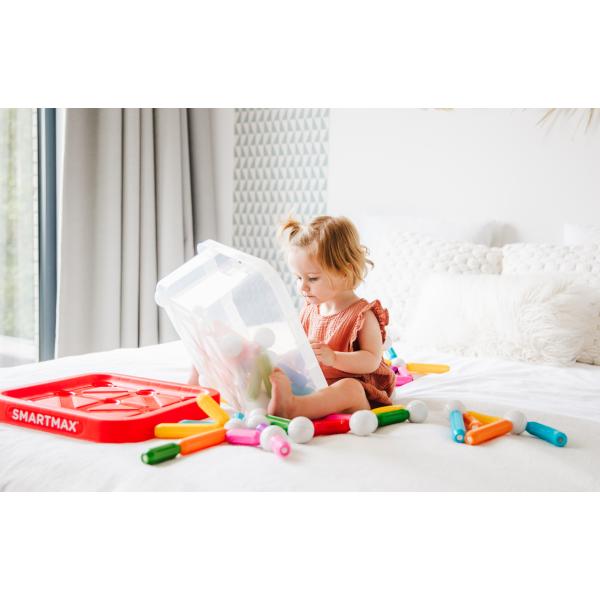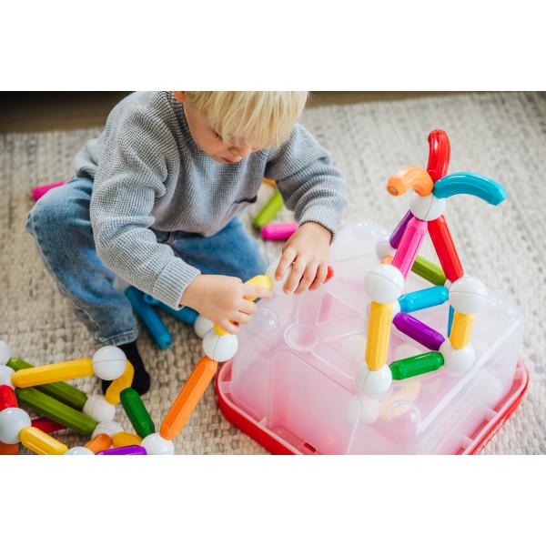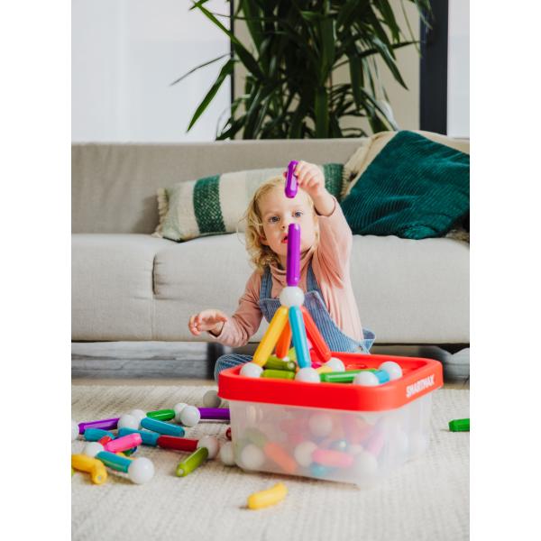 Velký kontejner obsahující 100 ks magnetických stavebních dílů SmartMax je ideální pro stavění krásných velkých staveb či společnou hru více dětí nebo sourozenců. Z této sady děti postaví nádherné stavby, mosty a jiné. Je také ideální pro dětské koutky a školky. Stavebnice je uložena v praktickém kontejneru. Rudé víko i dno kontejneru zároveň slouží jako podkladové desky pro stavby. Přitahování a odpuzování magnetů děti okouzlí na jejich cestě za poznáním. Starší děti mohou budovat věže, mosty a další super velké stavby. Jednotlivé magnetické díly se jednoduše spojují jedním cvaknutím. Všechny díly lze kombinovat se všemi stavebnicemi SmartMax. Sada obsahuje: 48 krátkých tyček, 18 dlouhých tyček, 8 zahnutých tyček a 26 kuliček. Tato magnetická stavebnice představuje ideální hračku pro malé děti od 1 roku.