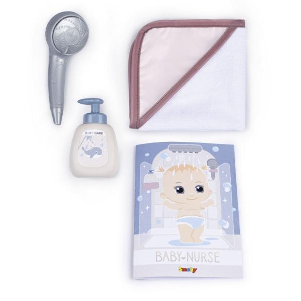 Sprchový kout pro panenky Baby Nurse s funkční sprchovou hlavicí, funkce proudu vody díky čerpadlu a nádrži na vodu.