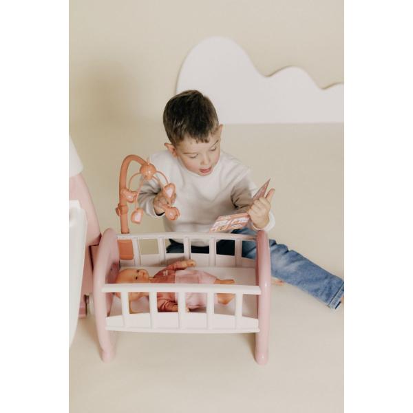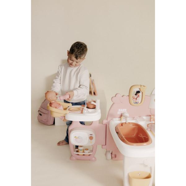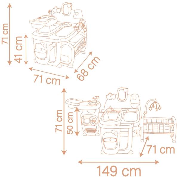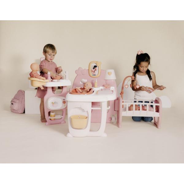 Hrací centrum pro panenky Baby Nurse s 3 hracími zónami je vybaveno transportními kolečky, rukojetí a je skládací pro snadnou přepravu. Po otevření překvapí třemi prostornými hracími koutky: kuchyňkou, koupelnou a ložnicí. Umývací prostor je vybaven odnímatelnou vaničkou, hned vedle je přebalovací pult, který zároveň slouží jako šatna. Pod komodou je věšák na ručníky, háček na kabát a vyjímatelný odpadkový koš. Rám obrazu na zadní stěně je možné přizpůsobit vlastními fotografiemi. Jídelní kout se sedadlem pro panenky má dřez s baterií (nefunkční), varnou desku, mikrovlnnou troubu a odkládací police. Spací část obsahuje postýlku pro panenky, otočný kolotoč a fosforeskující lampu. Příslušenství: lahvičky, talíře s lžičkami, hrnce, klinické teploměry a různé nádoby a prázdné obaly na hraní. Vhodné pro panenky do 42 cm (panenka není součástí balení). Tento výrobek obsahuje minimálně 78 % recyklovaného materiálu. Rozměry složeného produktu (DxŠxV): 68 x 71 x 71 cm. Rozměry produktu v rozloženém stavu (DxŠxV): 149 x 71 x 71 cm.