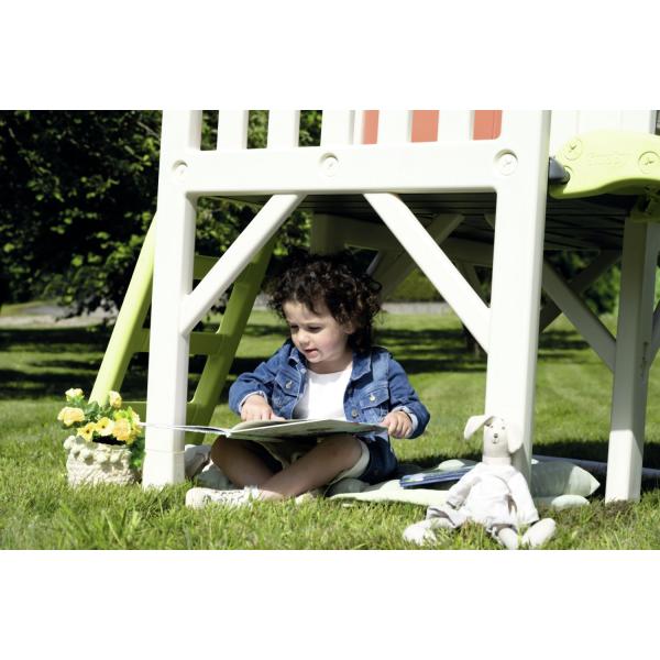 Vyrobený z kvalitního a pevného plastu, domeček je odolný vůči UV záření, což zaručuje dlouhou životnost i při častém venkovním použití. S maximální nosností až 4 x 50 kg se do něj mohou bezpečně hrát i více dětí najednou.