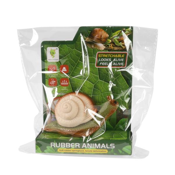 Tato hračka kombinuje pružné gumové tělíčko s pevným plastovým ulitou a měří přibližně 11 cm.