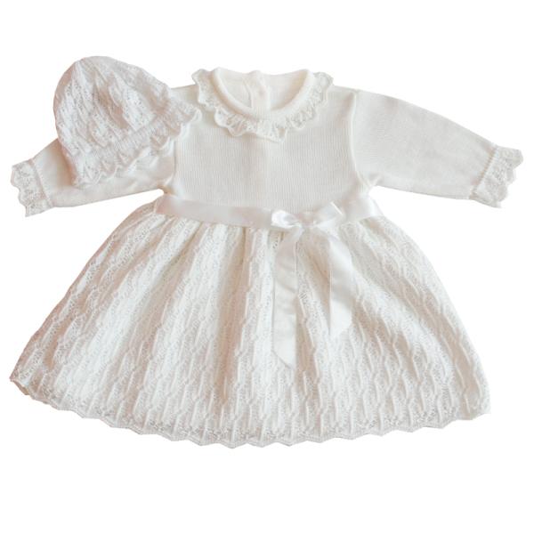 Souprava sestávající ze šatů a čepice je vyrobena z pleteniny s ozdobným ažurovým vzorem a ozdobnou stuhou. Složení: 65% Akryl, 35% bavlna Doporučujeme dodržovat prací symboly na etiketě výrobku. Kolekce byla vytvořena s ideou nejnovějších trendů a vytvořená s vášní pro Vás.