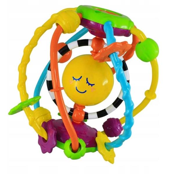 Hračka podporující smyslový vývoj batolete. Míč se skládá z barevných provazů a kuliček s různými texturami, které stimulují hmat a zrak. V horní části míčku je prvek, který při otáčení vydává vtipný chrastící zvuk. Hračka je určena pro děti od 6 měsíců.