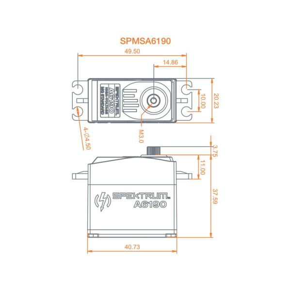 Charakteristika:Kvalitní digitální servo standardní velikosti Spektrum A6190 pro větší RC modely letadel. Kovové převody, 2x ložisko, napájení 4.8-8.4V, moment 6.4-8.3kg.cm, rychlost 0.22-0.13s/60°, rozměry 37x20x40mm, hmotnost 54 g, tisícihran 23T.