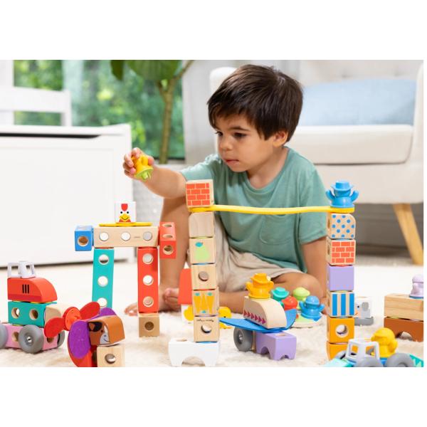 Masivní dřevěné stavební bloky na spojování a hraní jsou ideální pomůckou pro děti od 2 let, které si při hře rozvíjejí klíčové schopnosti – jemnou motoriku, logické myšlení, schopnost přiřazování, vyprávění příběhů i sebevědomí – a to vše zábavnou a tvořivou formou!